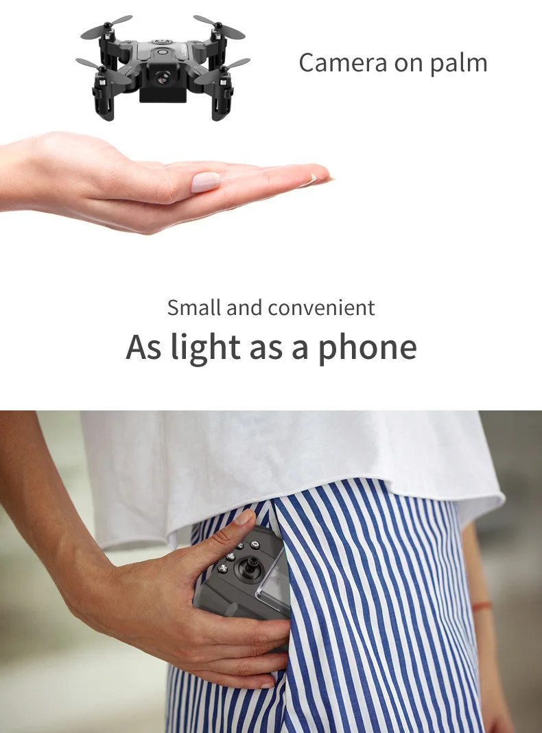 2.Pocket drone: The mini drone is super small in size and uses a foldable design. Almost all subjects can be put in the box, easy to carry, or can be put in a pocket.