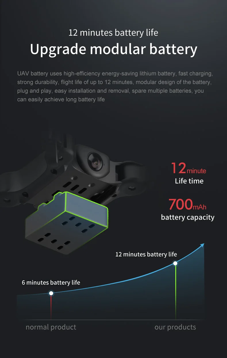 5.Suitable for beginners: intelligent programming design, easily control the pocket drone, just press the button to achieve the main functions, such as one -click return, one -click take -off, and one -click landing. The most important thing is that with the size of light and compact weight, drones can avoid being easily damaged.