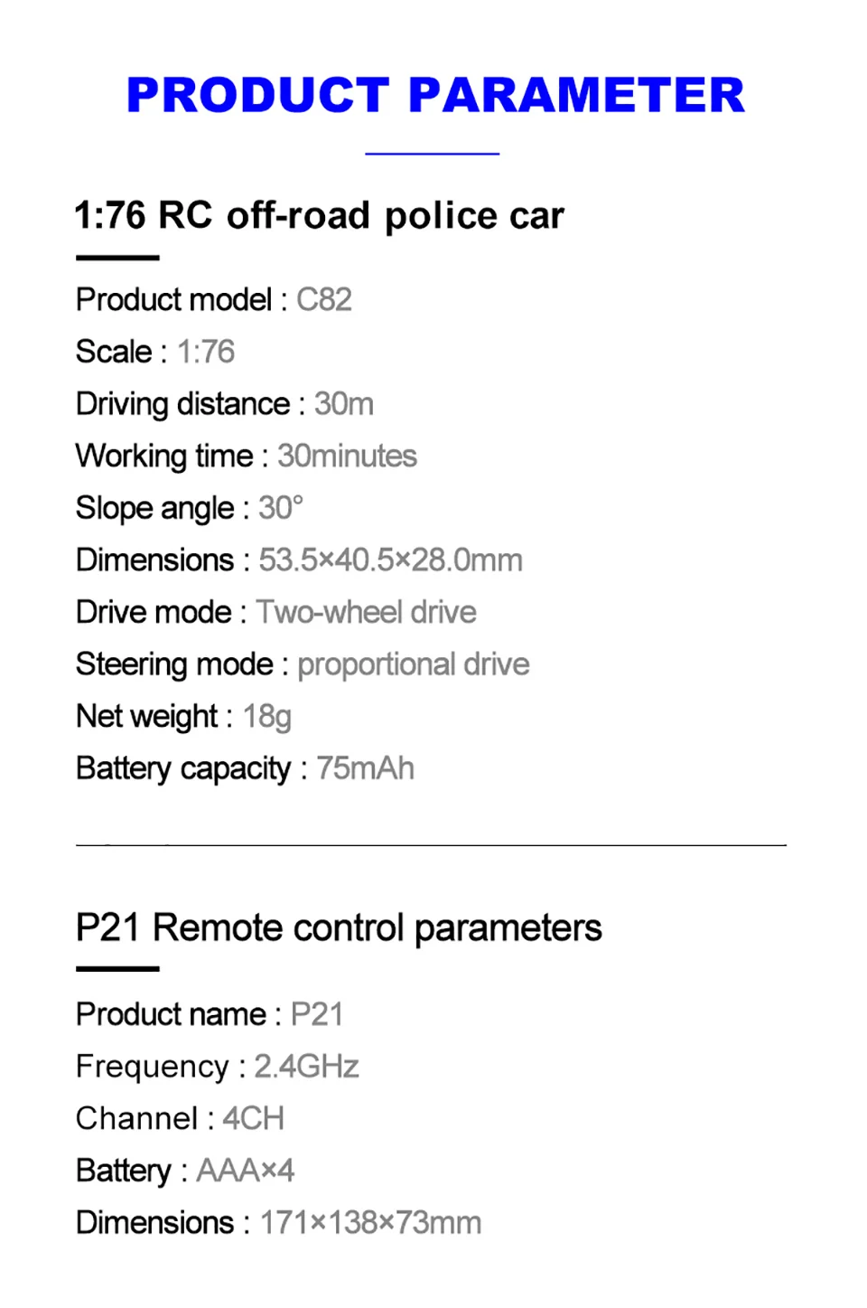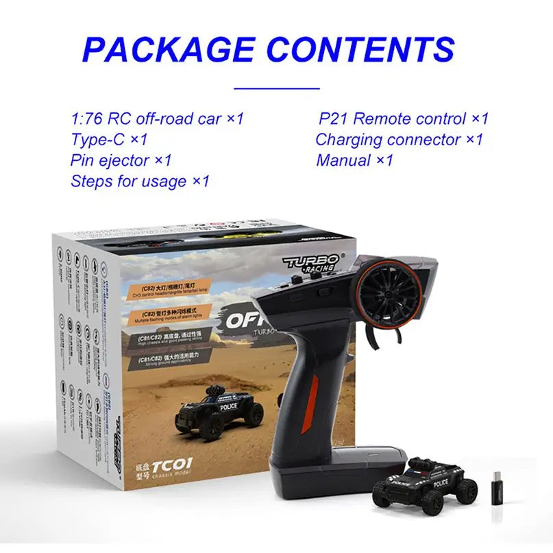 "Turbo charge your RC game with the Turbo Racing 1:76 C82 RC Police Truck RTR! Experience unmatched speed and maneuverability as you race through the streets like a pro. With this truck, you'll be the envy of all your friends. Ready to take on any challenge, this truck is perfect for all your RC adventures!"